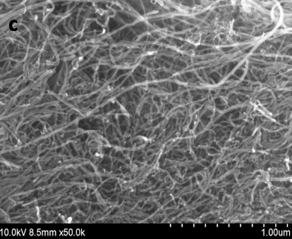 CNTs have been primarily synthesized with the chemical vapor deposition (CVD) but have been produced with other methods such as arc discharge and laser-ablation.6 Synthesizing well-aligned SWNTs was found to be a promising material in a number of applications such as transistors, sensors and additives for batteries. MWNTs have been appropriate as conductive polymers since it is highly conductive and for water filtration membranes due to its larger surface and strong mechanical strength.7 Meanwhile, the DWNTs can take on four distinct permutations from the metallic or semiconducting properties of their inner and outer walls that are typically used in thin film electronics and transistors; however, it is still quite a complicated system due to its polydiversity.5 ACS Material provides SWNTs, DWNTs and MWNTs with varying lengths, purity and functionalized options. In Figure 1 (a-c), the SEM images of ACS Material SWNTs, DWNTs and MWNTs are shown.